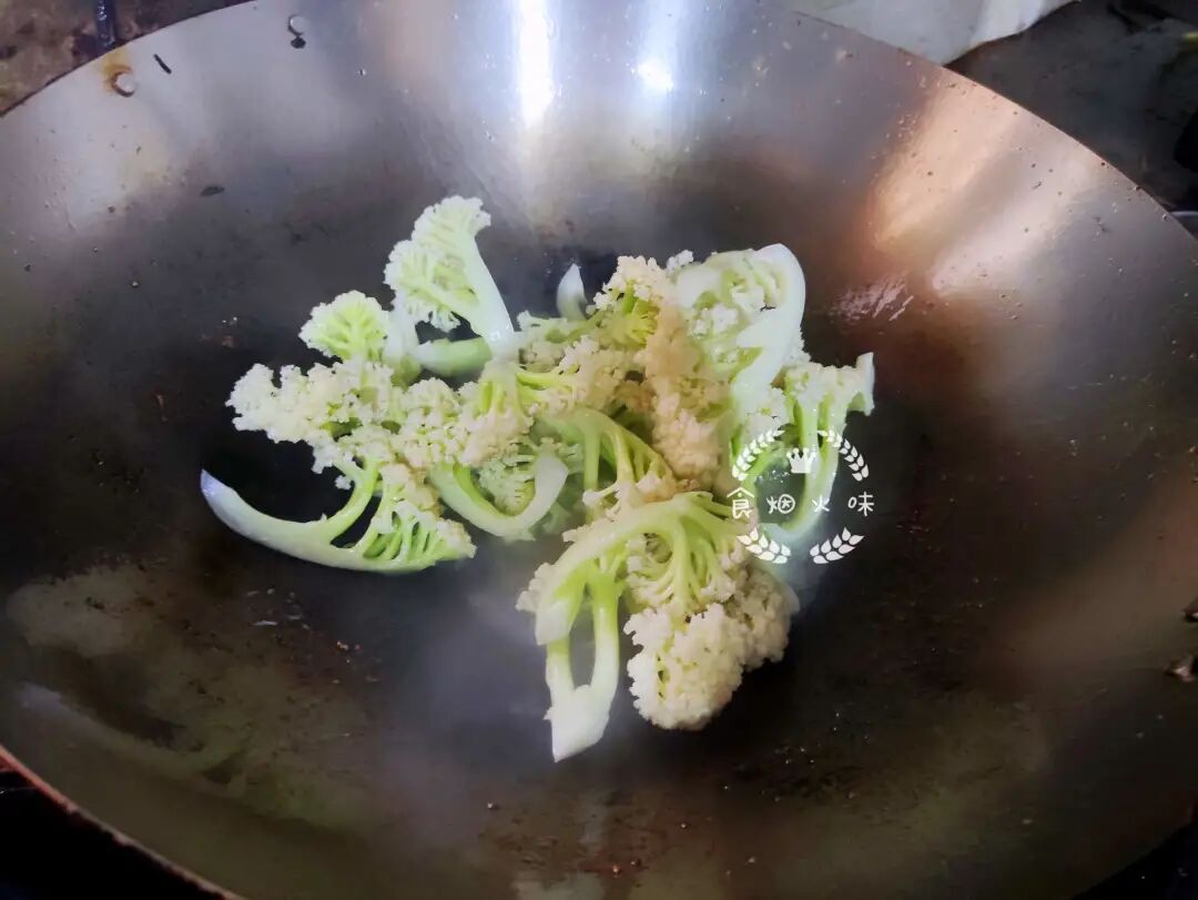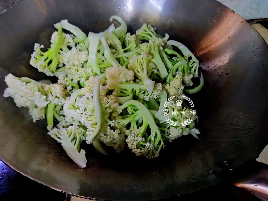 3.花菜倒入锅中后,铲子翻动一下。因为花菜中水分丰富,所以煮的过程中不用另外加水了,加水煮后的花菜,口感变淡了。