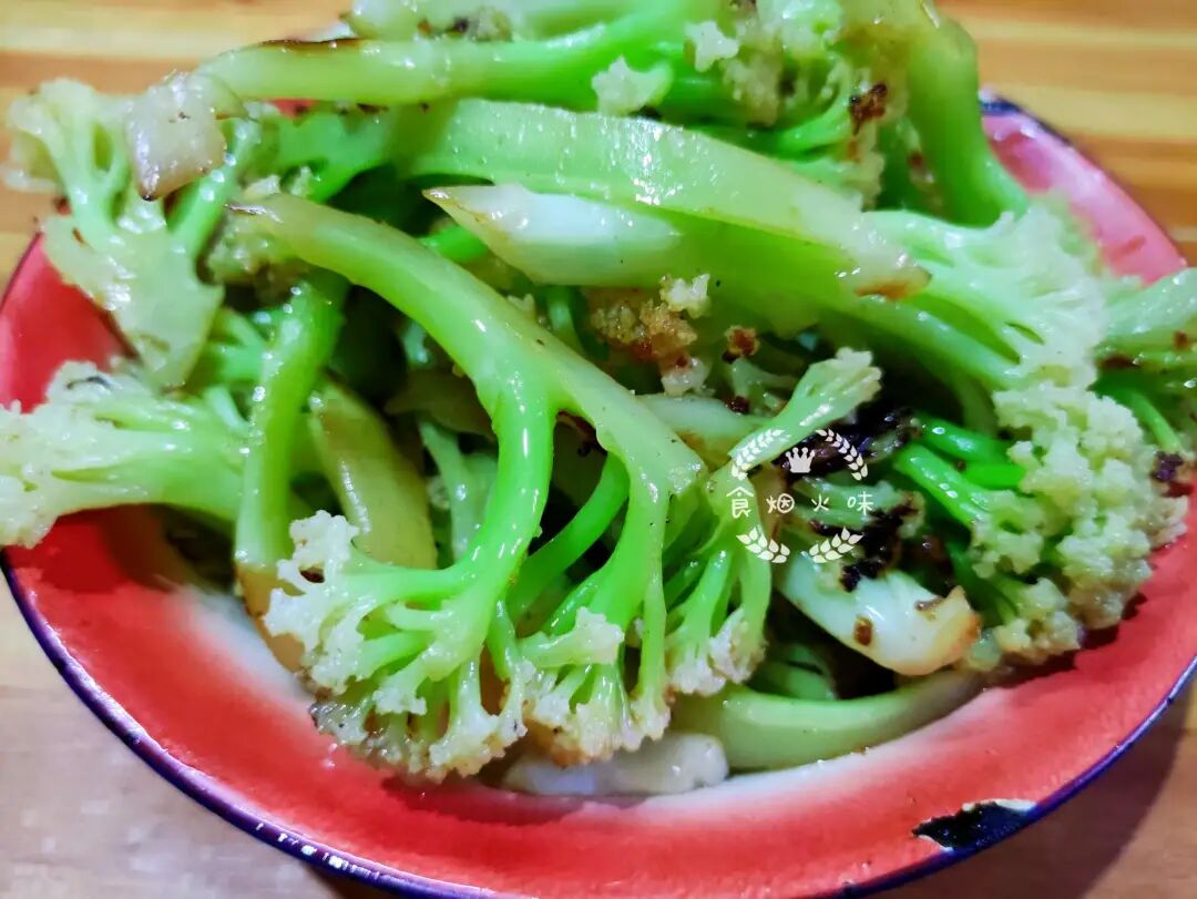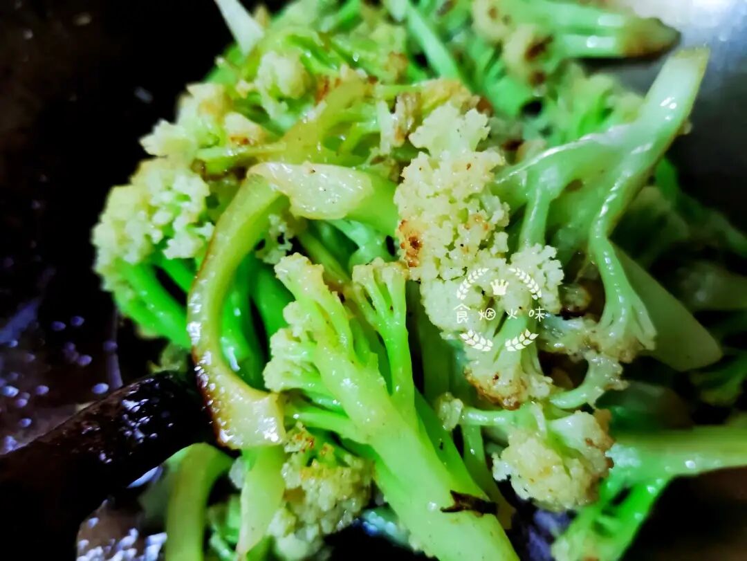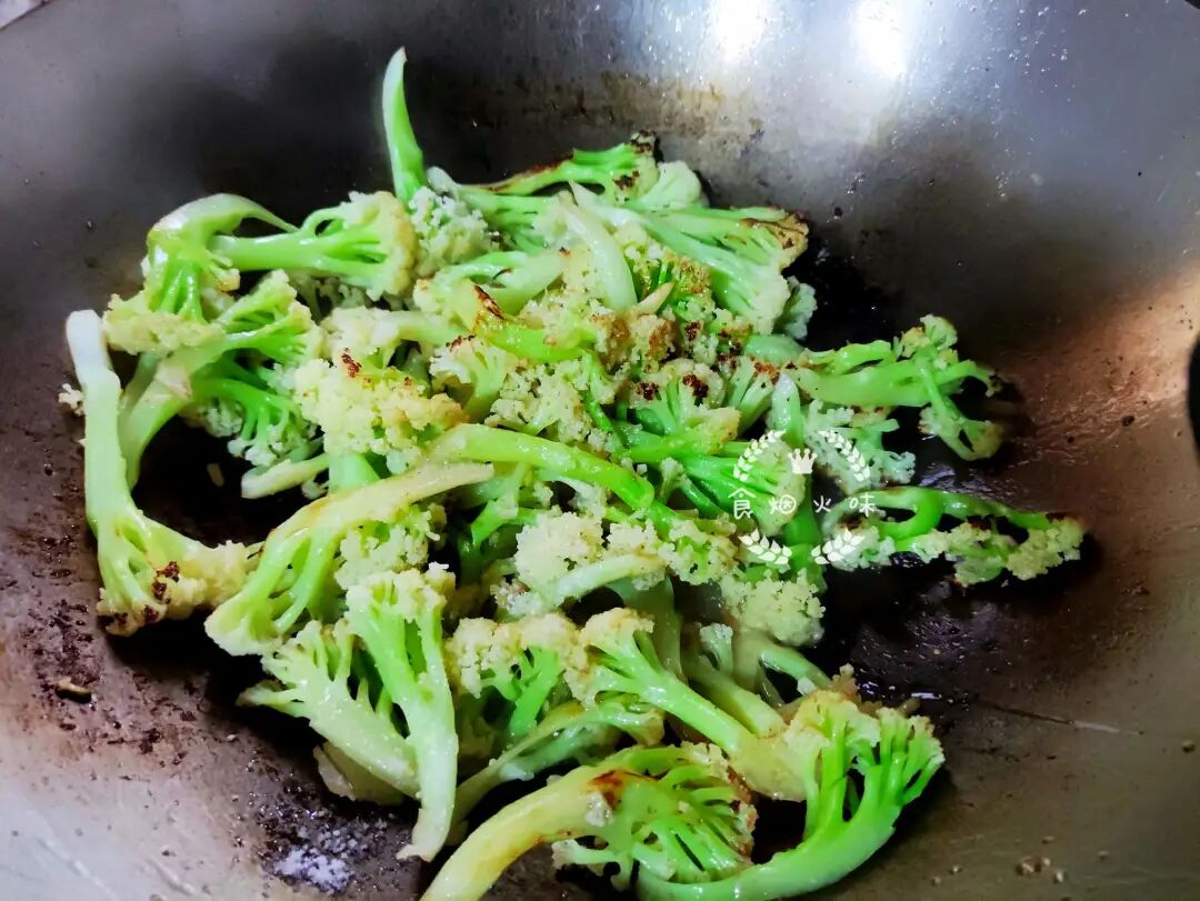 5.铲子翻动后放着继续炒均匀,将锅中的花菜炒到表皮有点焦焦,如下这种状态。