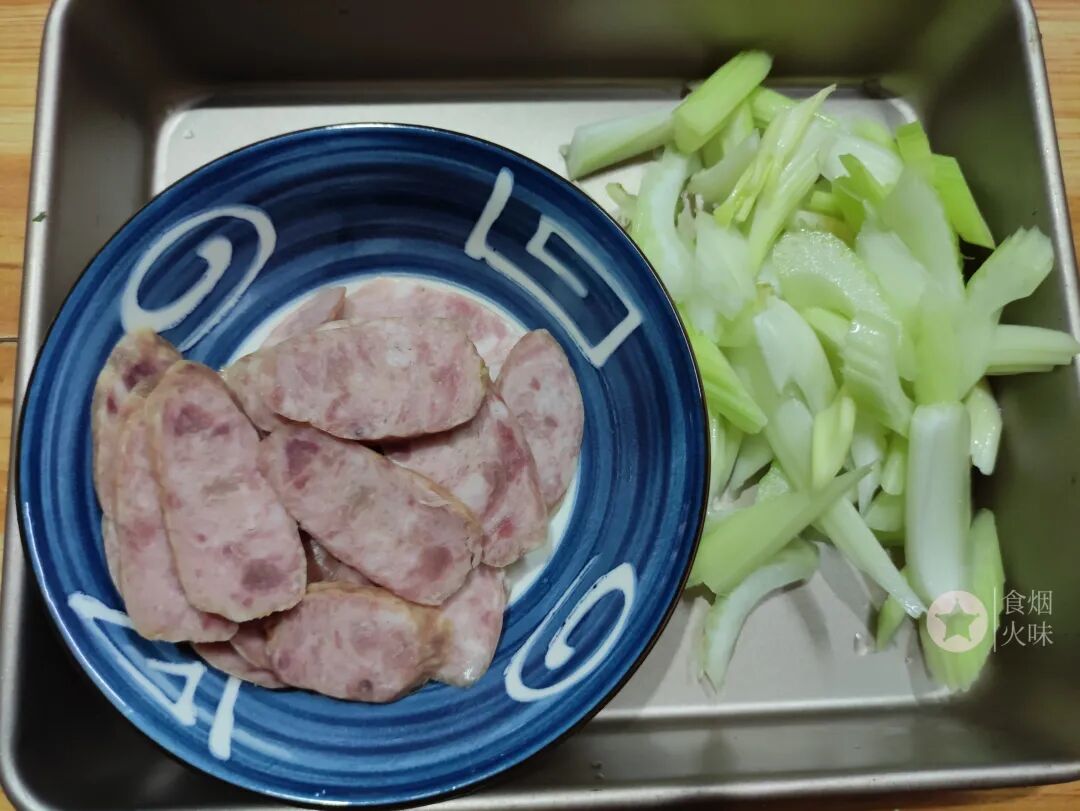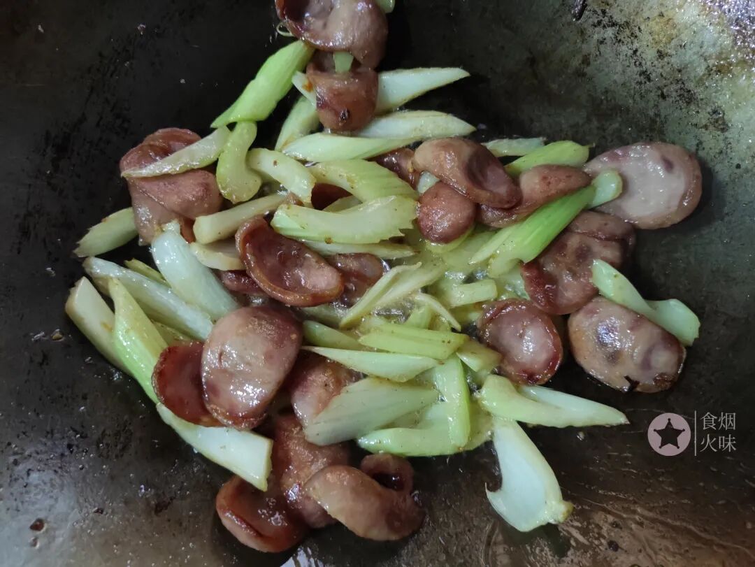 3.腊肠炒香后,将切好的西芹倒入锅内。炒西芹不容易吸油,所以煮的时候加入的油要少点,油太多,菜煮熟,锅底会有一层的油。