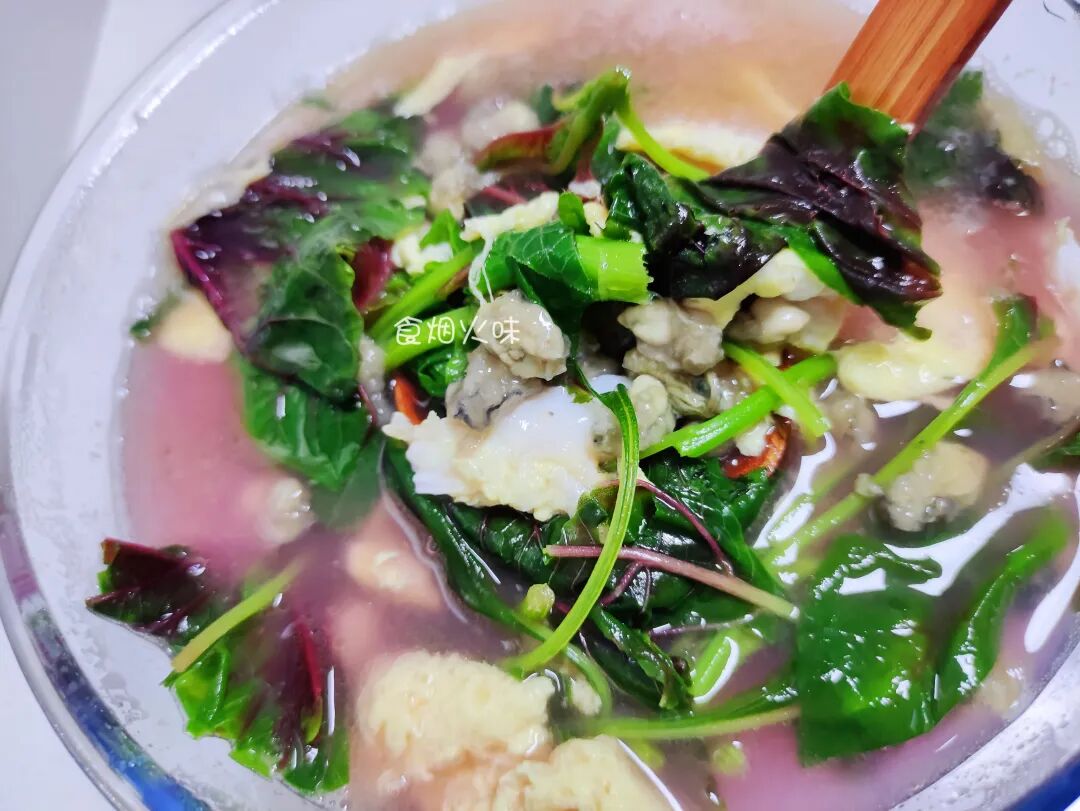 5.这道汤很鲜美,而且口感也好,关键是做法也特别简单。锅中的水开后,将准备好的海蛎倒入,用筷子将它们搅拌均匀,水再次开后,倒入切好的苋菜,用铲子将它搅散。锅中的苋菜煮熟后,加入食盐,一点点的鸡精调味一下。味道刚好即可关火出锅。