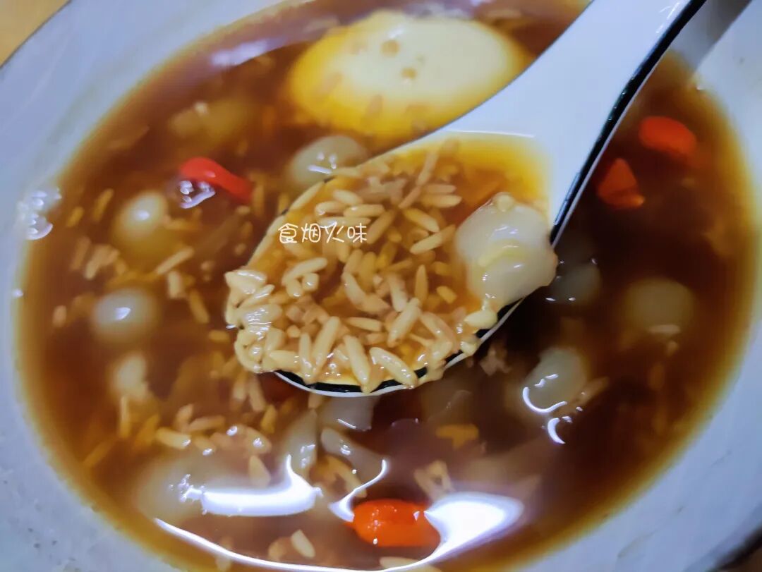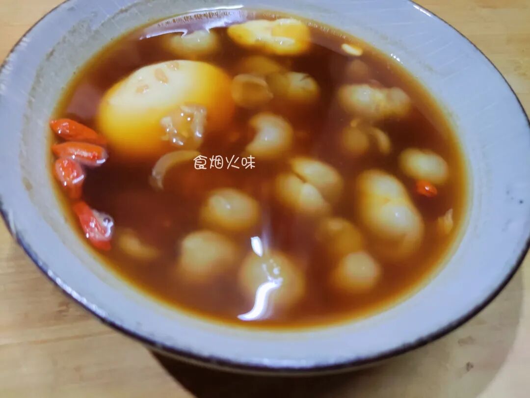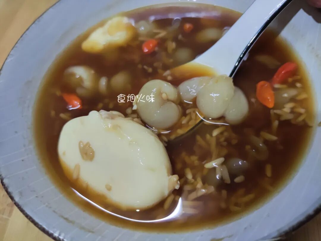 一股淡淡的酒香味的米酒龙眼红蛋就完成,甘甜鲜美。而且蛋很嫩滑,龙眼肉清甜,味道好极了。