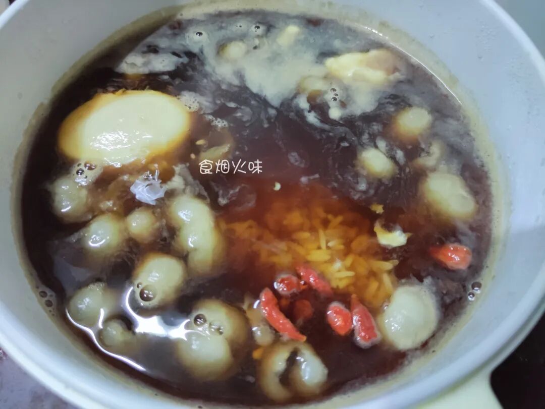 3.蛋煮得快熟后,将备好的红糖倒入,还要加入两勺的米酒,倒入枸杞。用勺子将它们搅动均匀。锅中的食材都煮好后,就可以准备关火出锅了。