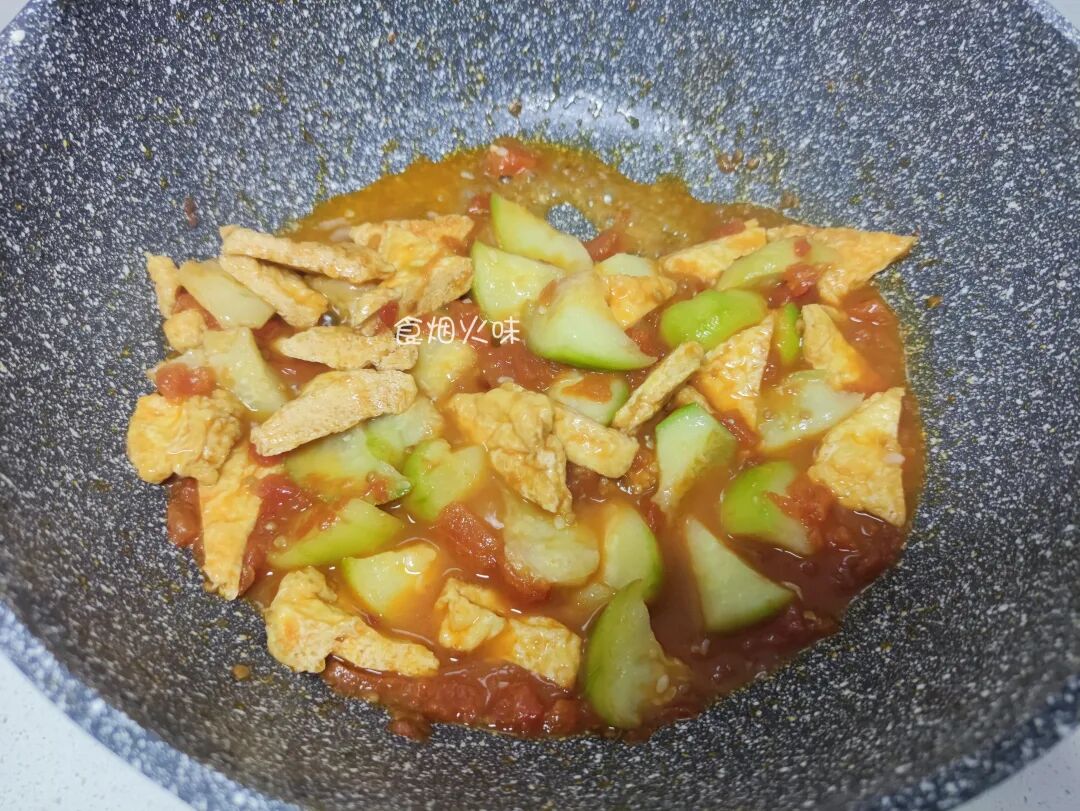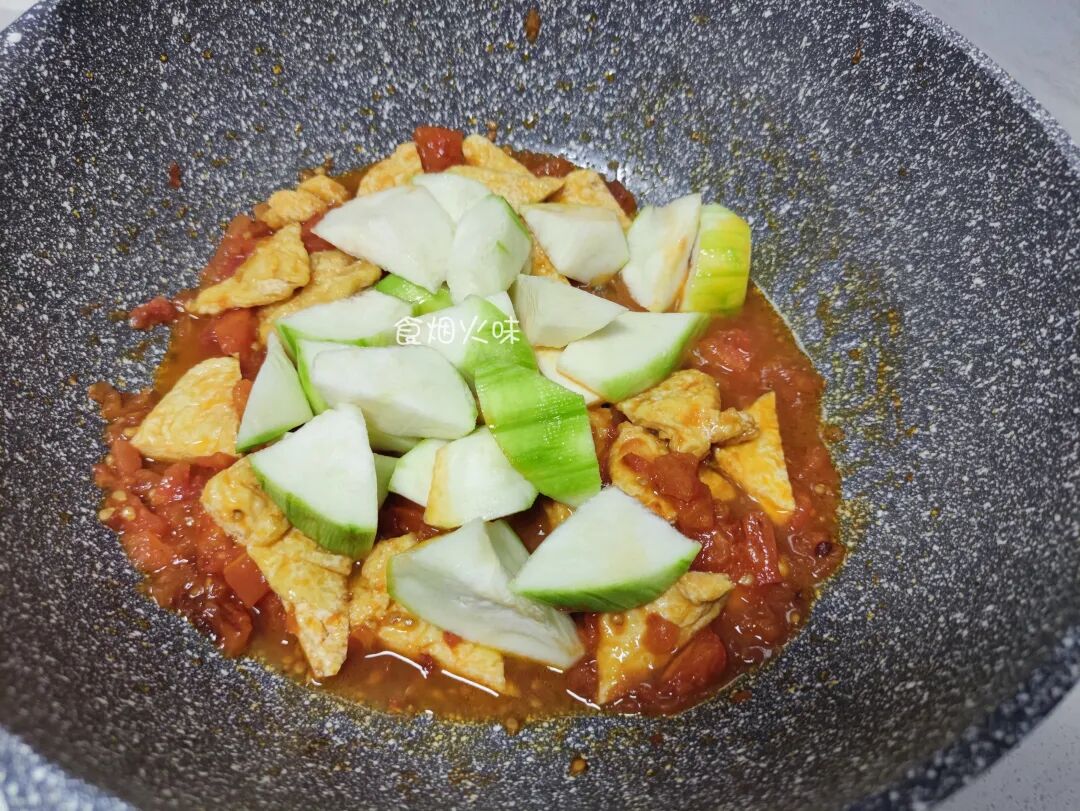 5.将准备好的豆腐块倒入锅中,用铲子将它们翻炒均匀,切好的丝瓜也倒入锅中,再次翻动。如果喜欢有点汤汁,可以往里面添加点水,然后盖上盖子焖煮5分钟左右;