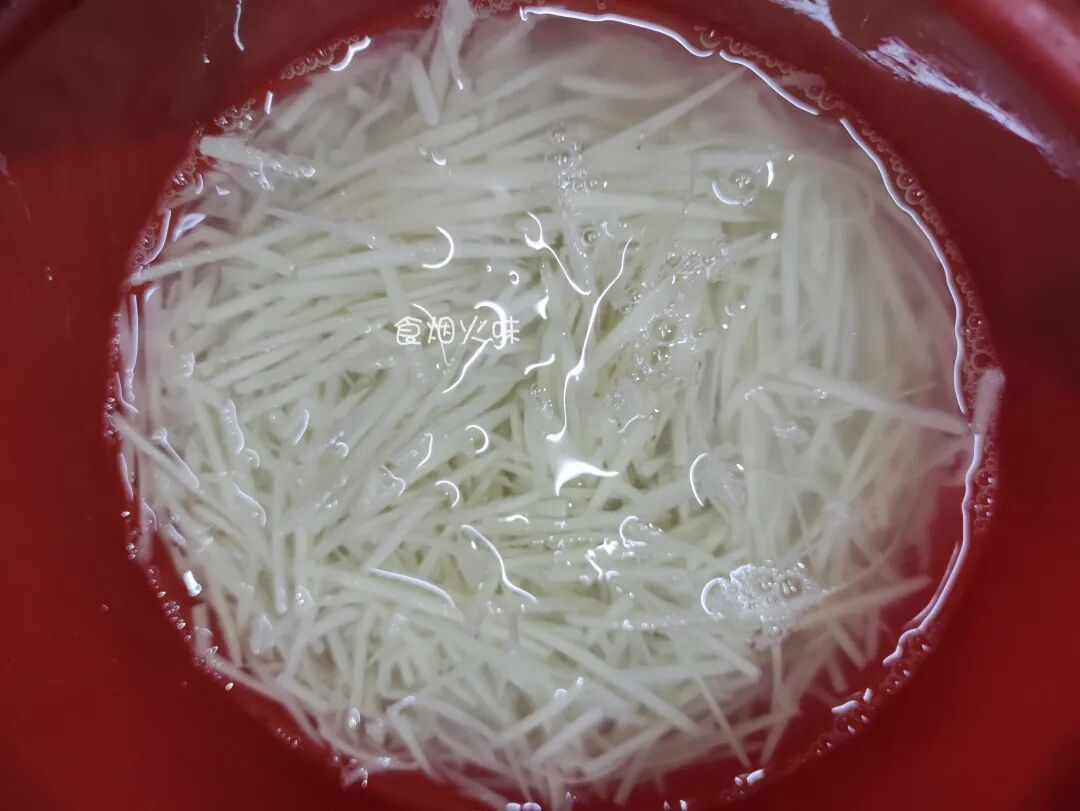 3.准备一个干净的锅,往里面加入适量的水,食用油,倒入洗净后的莲藕丝。莲藕在高中烧水1-2分钟,然后捞出来用冷水浸泡会儿,使其口感爽脆可口;