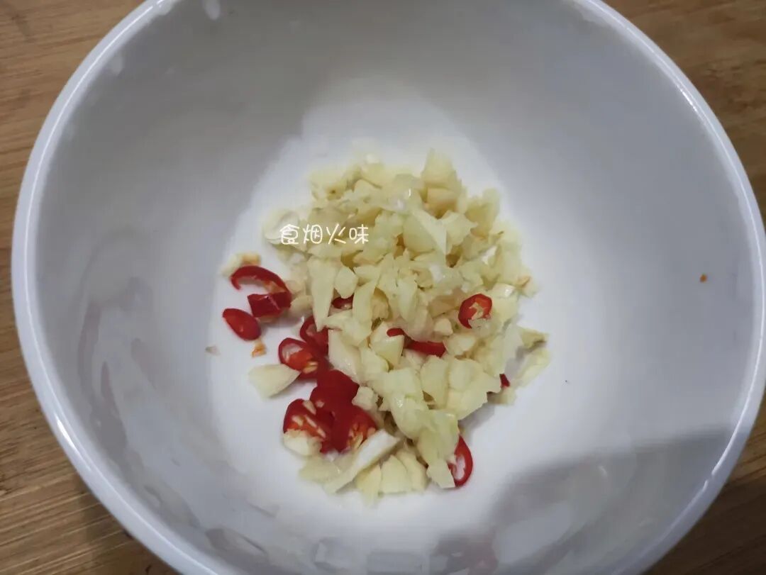 5.过凉水后的莲藕片放盆中,大蒜辣椒沫倒入盆中,加入食盐,白糖提鲜,少量香油增加香味;