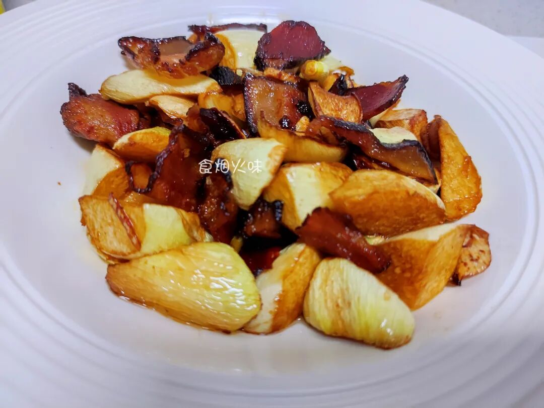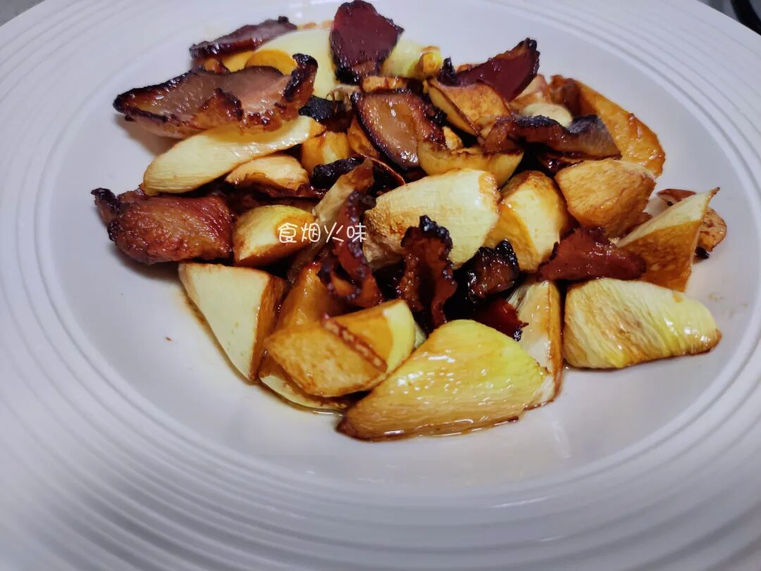 2.有加腊肉的话,要先将里面的油脂煸炒出来。茭白下锅后,煎至表面两面焦黄,口感鲜嫩美味。