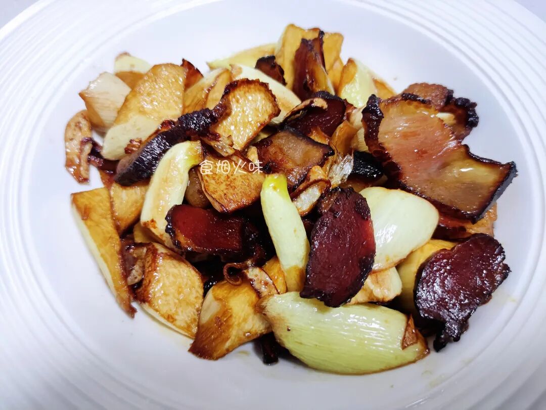 1.准备好的腊肉放在流动水中冲洗两三次,然后擦干其表面的水分,放在案板上切成细片,切好后放在盆中备用。葱头也洗净,切片放一旁备用;