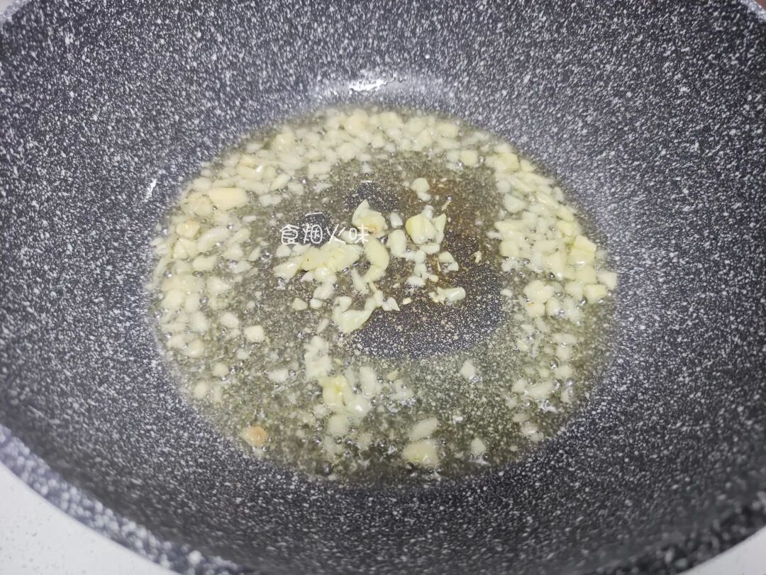 2.准备一个干净的锅,锅中的水分干后,倒入适量的油,将切好的蒜泥倒入锅中,用小火慢炒,煸炒出蒜泥的香味。炒的过程中,火不能太大,容易将蒜泥炒焦;