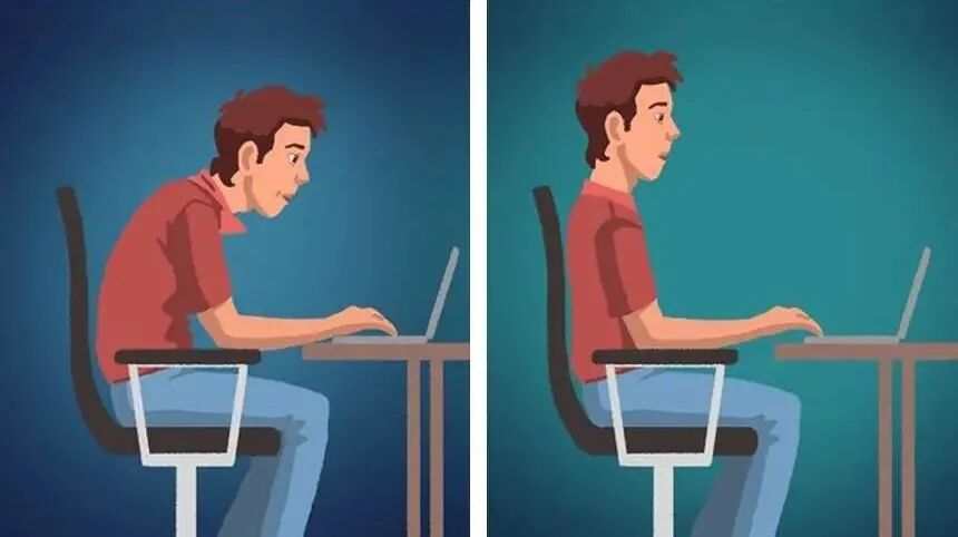 把你那头前倾、弯腰驼背、耸肩的坐姿改改!日复一日将会引起更多的体态问题。正确的坐姿应该如右图,目视前方、腰背挺直与大腿成90°,不要瘫坐在凳子上