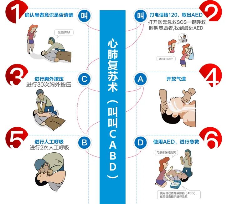 最后,送上一张猝死急救步骤图,希望大家扩散出去,如果能抓住昏倒后的“黄金4分钟”对其进行急救,或许就能救回一条人命