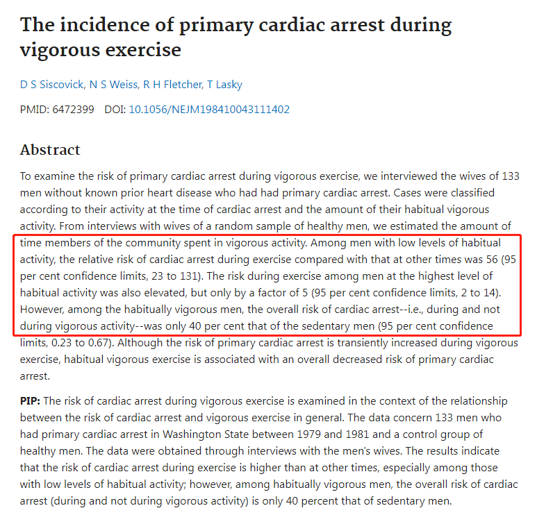 在习惯性体育活动水平低的健康男性中(就是平时不咋练),剧烈运动期间猝死的风险会高出56倍。