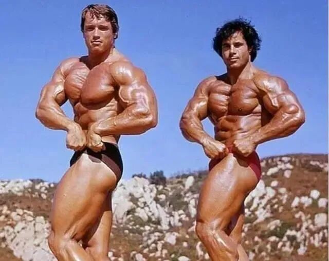 就像施瓦辛格(189cm,103kg)和好友哥伦布(165cm,83kg)俩人维度都很大,但一对比,还是可以看出州长的肉量要强于哥伦布。