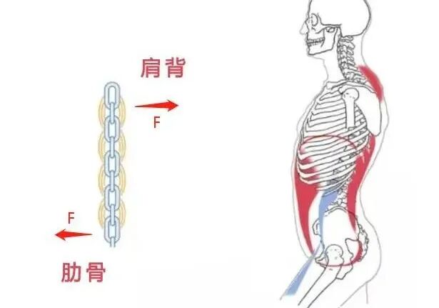 我们的上背部肌肉和肋骨分别位于胸腔的两端,上背部在上端,而肋骨在末端,如果背部这边紧张的话,那肋骨末端就更易向外翻。