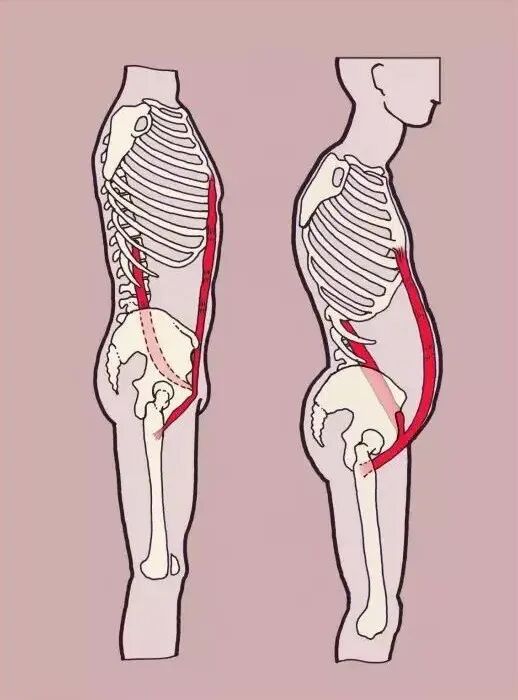 同样骨盆前倾带来的还有——脊柱不在中立位,就无法保证在运动时躯干的稳定,发力不均匀,就会引起肌肉的代偿发力,从而导致肋骨外翻。