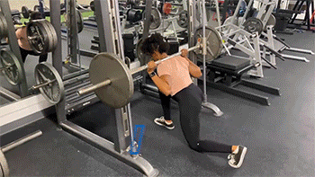 史密斯后弓步蹲:后撤步,支撑臀腿发力。