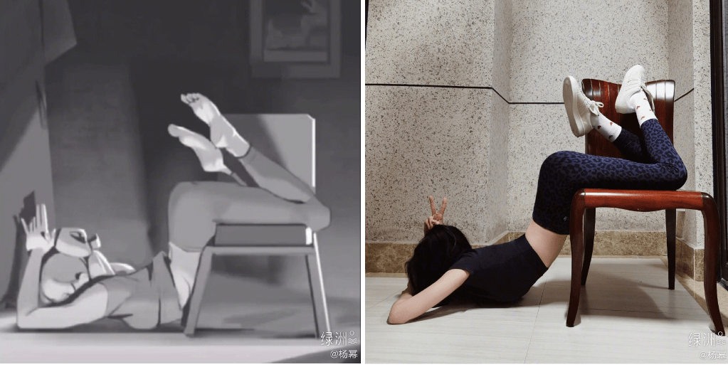 这个动作要求挑战者必须上身尽可能趴在地上,两腿尽可能分开,臀部翘起来,有点像小动物伸懒腰一样。