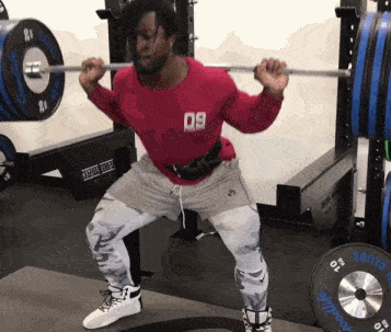 ②杠铃深蹲,下蹲至大腿与地面基本平行,稍作停留后再直起身体。