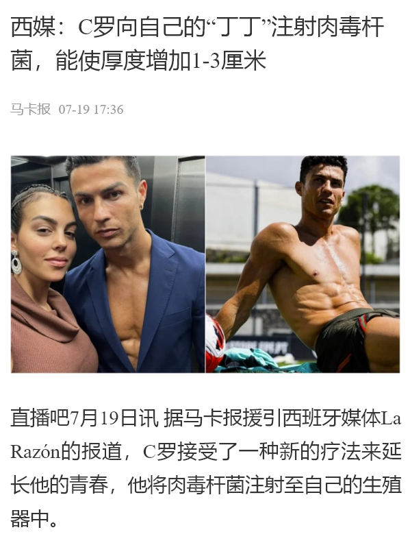 据西班牙主流媒体《真理报》报道,C罗最近一次做医美,给隐私部位打了肉毒素,只需1针,JJ变丁丁,增粗1-2.5厘米。