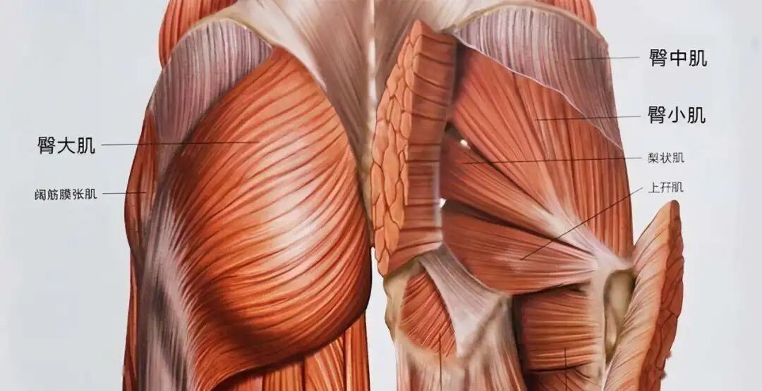 不信你现在摸摸自己大腿上方的部位,是不是有一个“坑”?至于原因,看看臀部肌肉的解剖图你们就懂了