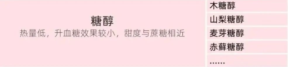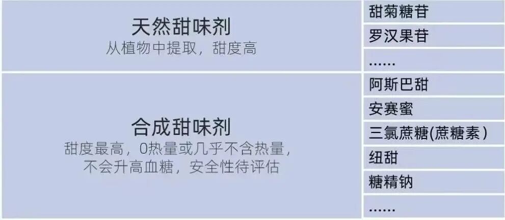 另一种是代糖,相比传统的添加糖,代糖热量很低,或者几乎不含热量: