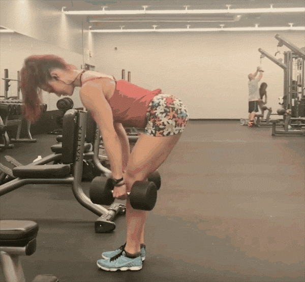 臀大肌强,大腿后侧怎么能弱?这个动作将臀部、腘绳肌一把抓,双手持哑铃,俩哑铃在俯视角度呈“八”字型。