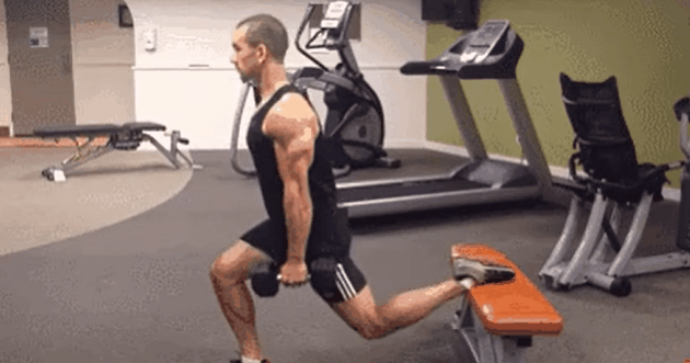 这是MAX认为最适合男生的最酸爽的动作,脚背放在卧推凳上,另一条腿弓箭步,建议单手(后撤腿那一侧)持哑铃,可以更好地平衡