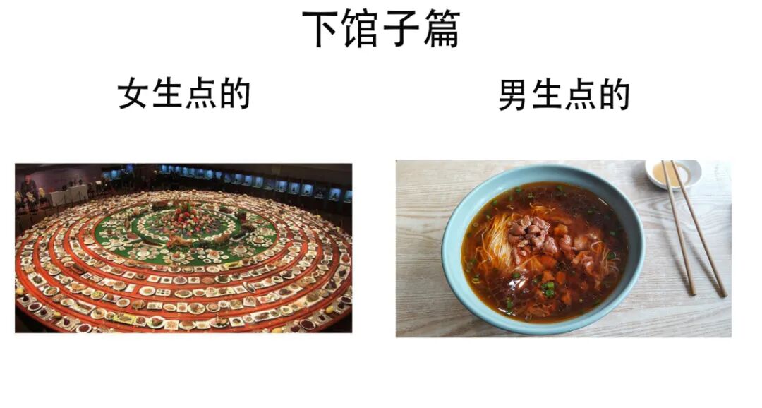女生非常讨厌做选择题,如果比较难选那就全点吧。而男生出门吃饭,更想目的性。就拿MAX我来说,没有牛肉的一顿饭是没有灵魂的。我的菜单里只有牛肉和其他菜两种选项。