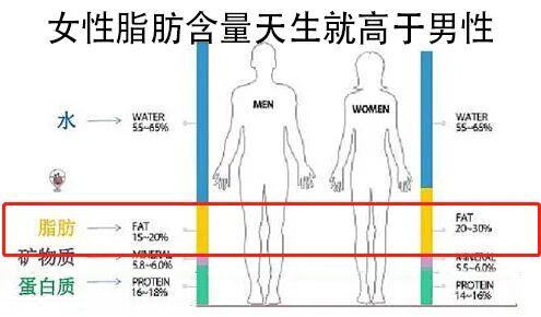 据研究表明,女生的体脂率天生就比男生要高10%左右。因为女生还肩负重任要养育小宝宝,所以身体自然是要储存更多的能量为下一代着想。