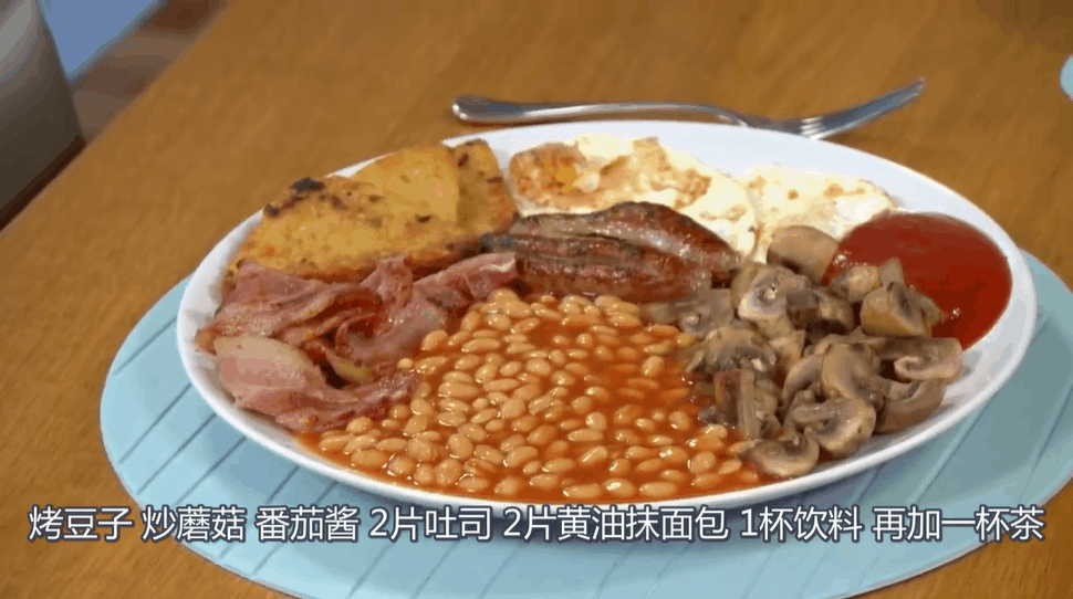 而L.J准备的早餐简直快赶上她一天的量了,有2个煎蛋,4片培根,两根香肠,三个薯饼,烤蘑菇,烤豆子,两片吐司,两片黄油面包,加一杯饮料再加一杯茶。