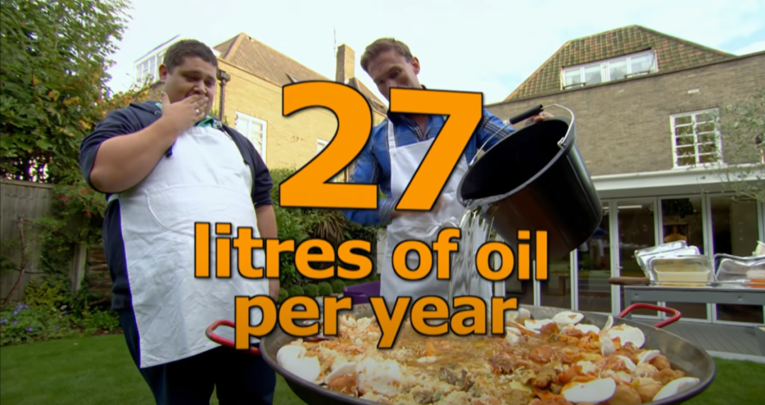 更恐怖的是,L.J每年从快餐里摄入的油高达27升!我算了算,我每天用30g,这油都够我用好几年了吧。正常人一天摄入30g的油才是比较健康的。