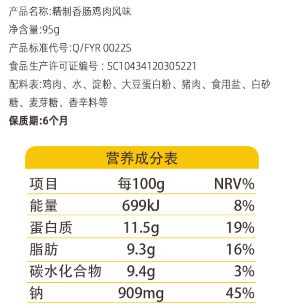 11.5%的高蛋白、低热量就注定它能成为健身人士的饭后小零食!而且50g肠里竟然有49g的鸡肉!几乎做到0淀粉,让你一口下去满是鸡肉!