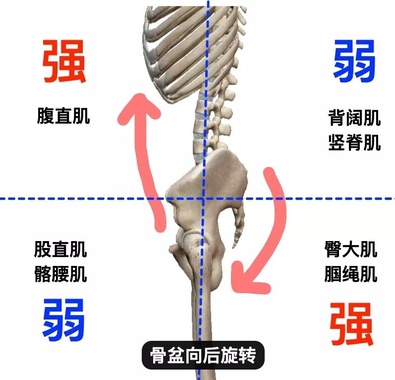 骨盆前倾归根结底就是:腹直肌长期处于放松状态,髂腰肌处于紧张状态,臀大肌经常久坐无力。肌肉不平衡的拉扯造成了骨盆的旋转。