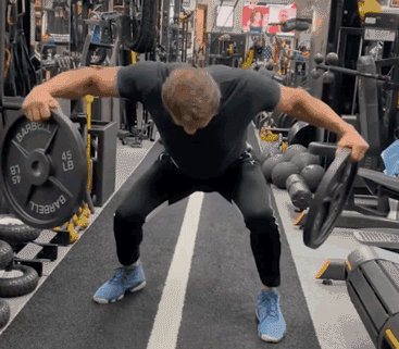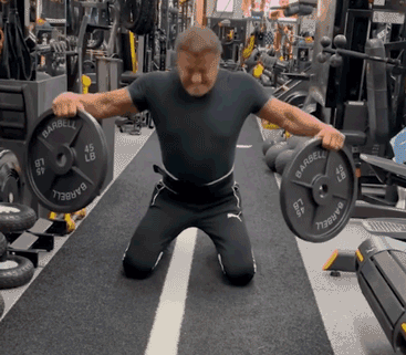 视频中的史泰龙先是跪在地上,双手徒手抓了两个杠铃片,吃力地抓离地面,并张开双臂。
