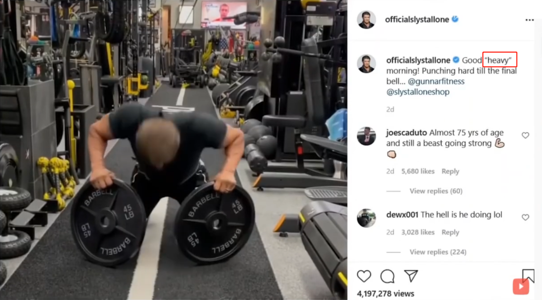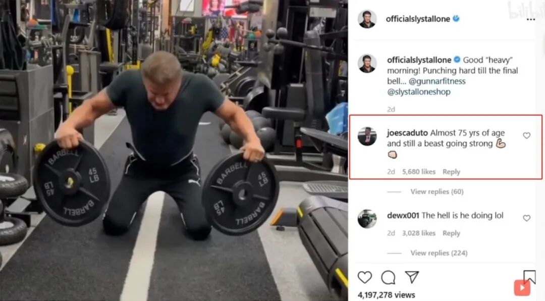 原来,最近史泰龙在ins上传了自己双手各抓一个45磅(约20.4kg)杠铃片的视频,播放量直逼500万,引发网友热议!