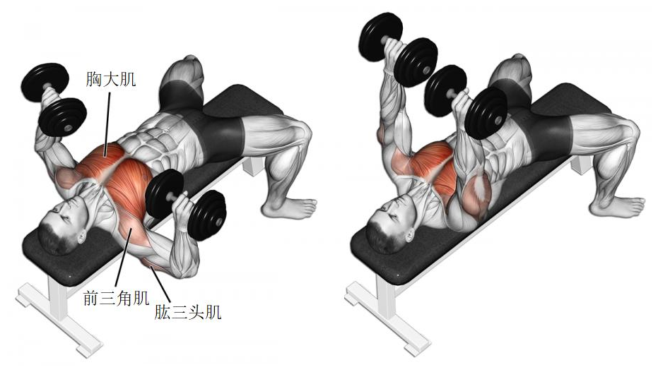 首先卧推主要依靠的是胸肌、三头肌、前三角肌,调动肌群较多,所以能推起的重量也会比较大。