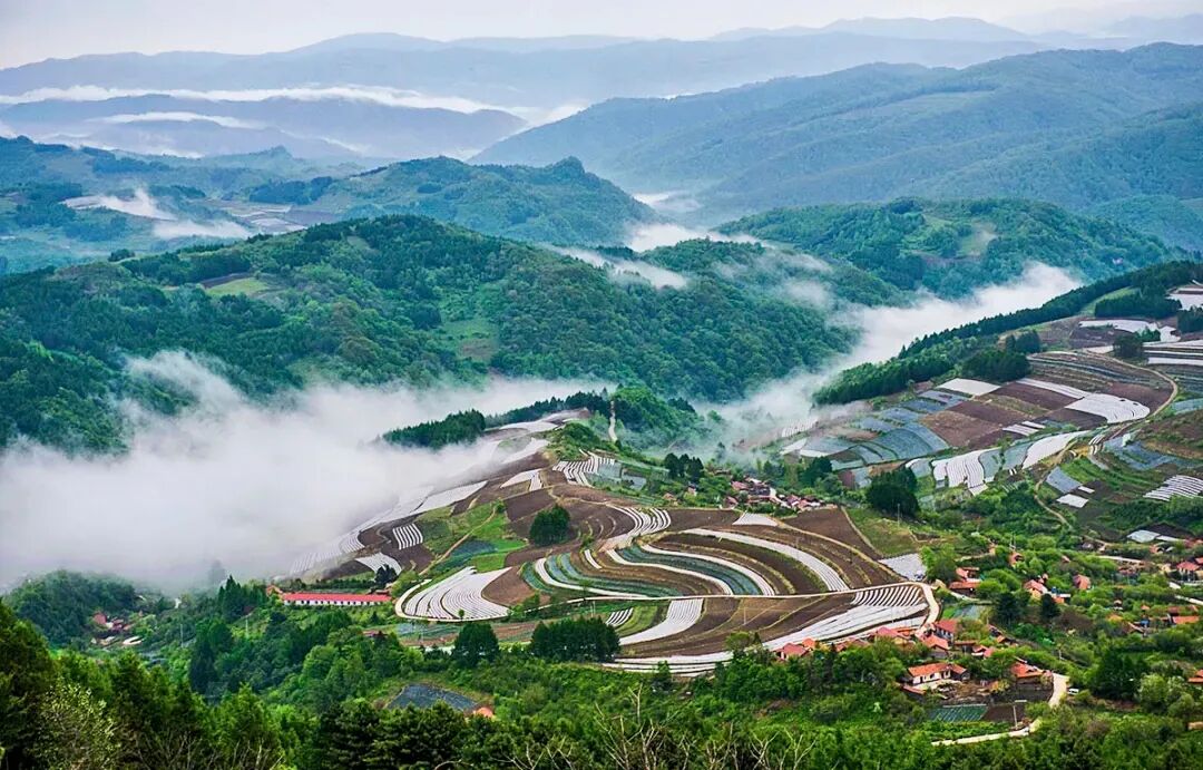 距离临江市 24 公里处的松岭雪村,是其花山镇珍珠村下的一个自然屯,这里四面环山,平均海拔 900-1100 米,房子依山而建,由于高度落差,能看到有区别于东北大平原的地貌,是全国有名的旱地梯田,也是白山市摄影家协会主要推荐地。