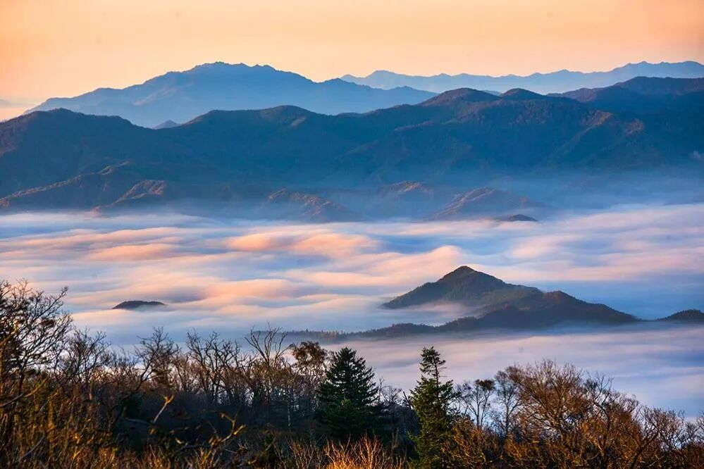 站在主峰远眺,可以体会一番“一览众山小”的豪情,淤积在大气中的微尘颗粒给远处群山带来了一层水墨画效果。因山高林密,在雨后初霁后,还可欣赏到云海奇观。