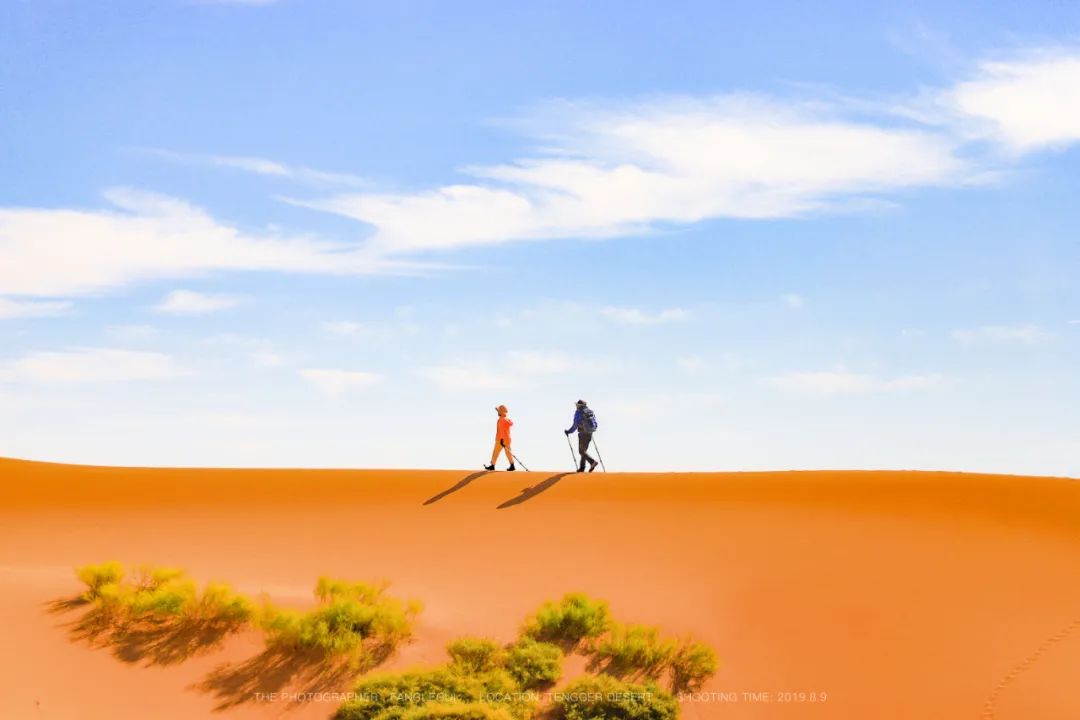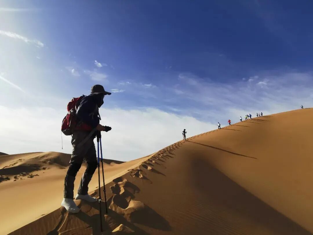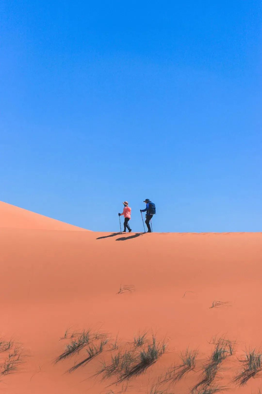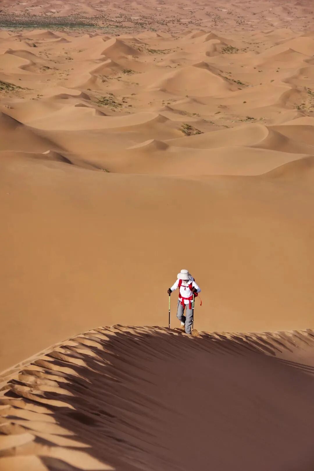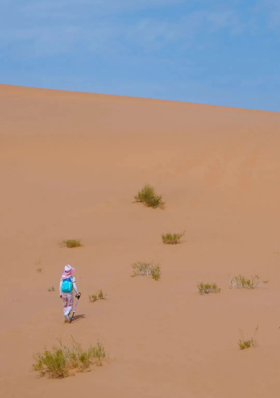 在这里,人对时间的感知会变慢,大概因为,作文里的“天地间”不再是一个抽象的概念,被纳入一个具体的、由眼前无边界的漫漫黄沙组成的画面,在天空与沙丘之间苍茫的空白里,你握紧手中的登山杖,像一只甲壳虫般平缓移动,变得渺小、缓慢、平静。