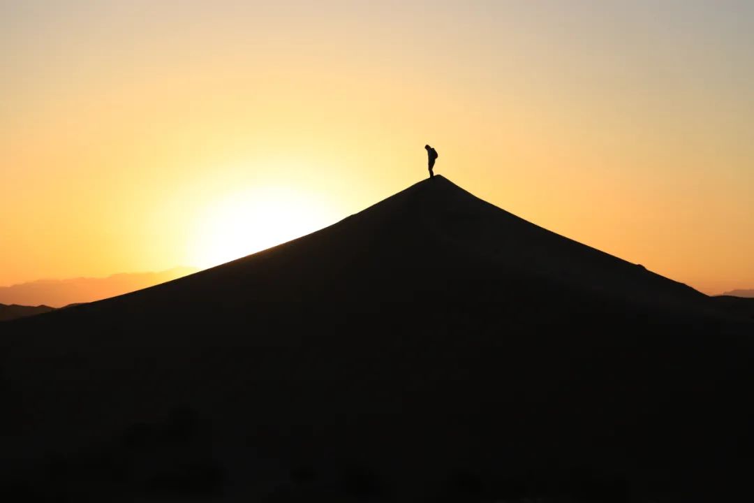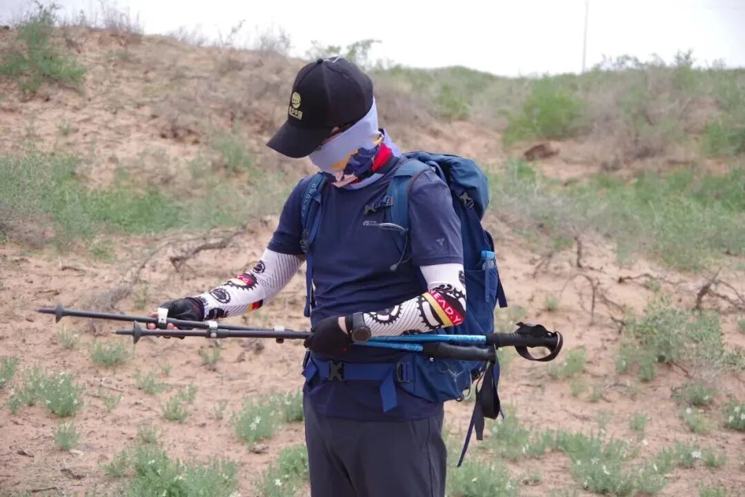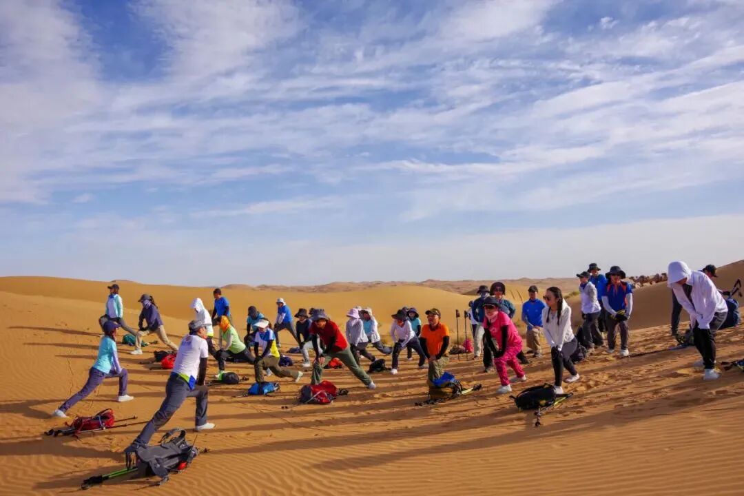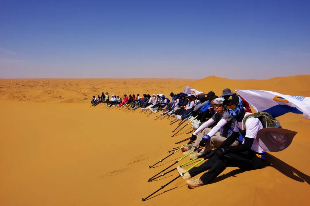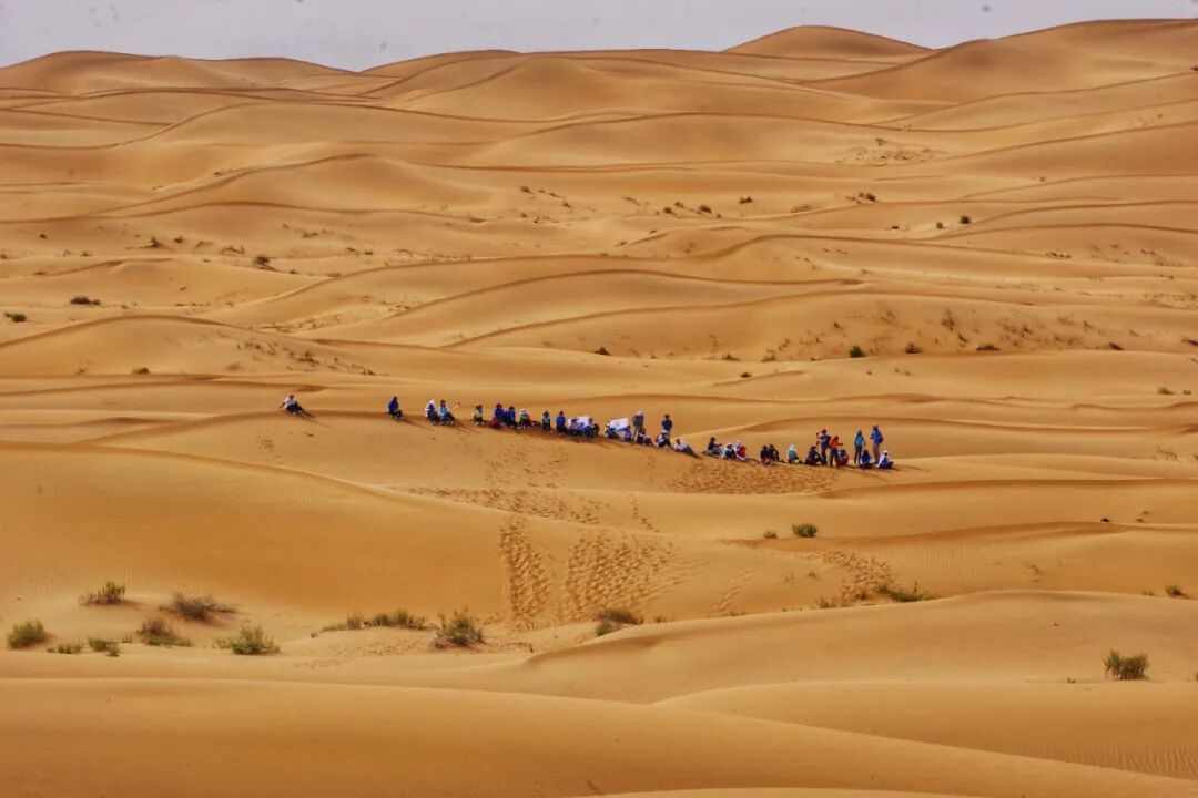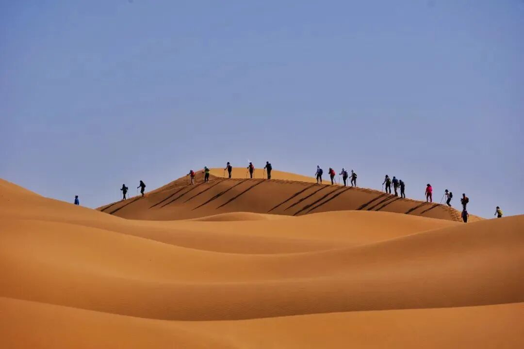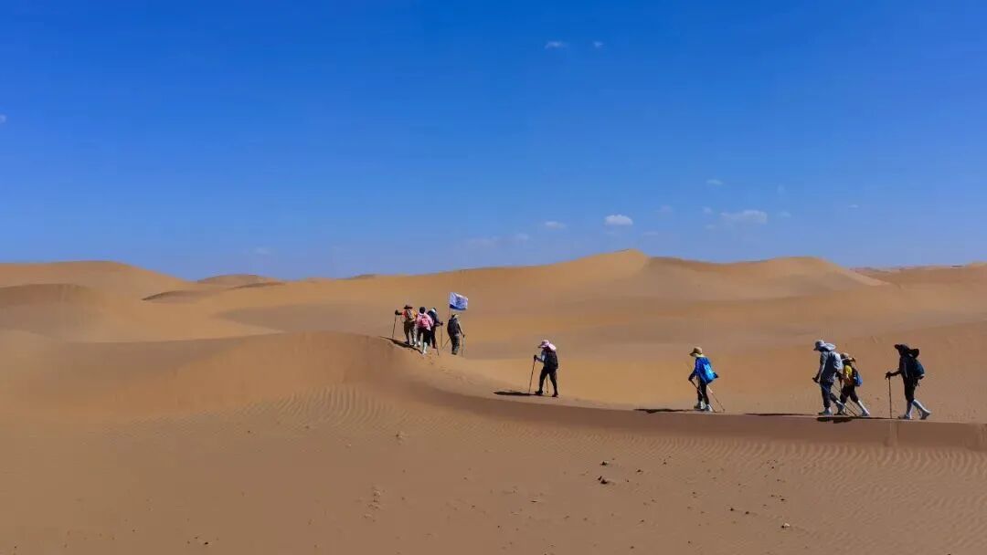 在这里,人对时间的感知会变慢,大概因为,作文里的“天地间”不再是一个抽象的概念,被纳入一个具体的、由眼前无边界的漫漫黄沙组成的画面,在天空与沙丘之间苍茫的空白里,你握紧手中的登山杖,像一只甲壳虫般平缓移动,变得渺小、缓慢、平静。
