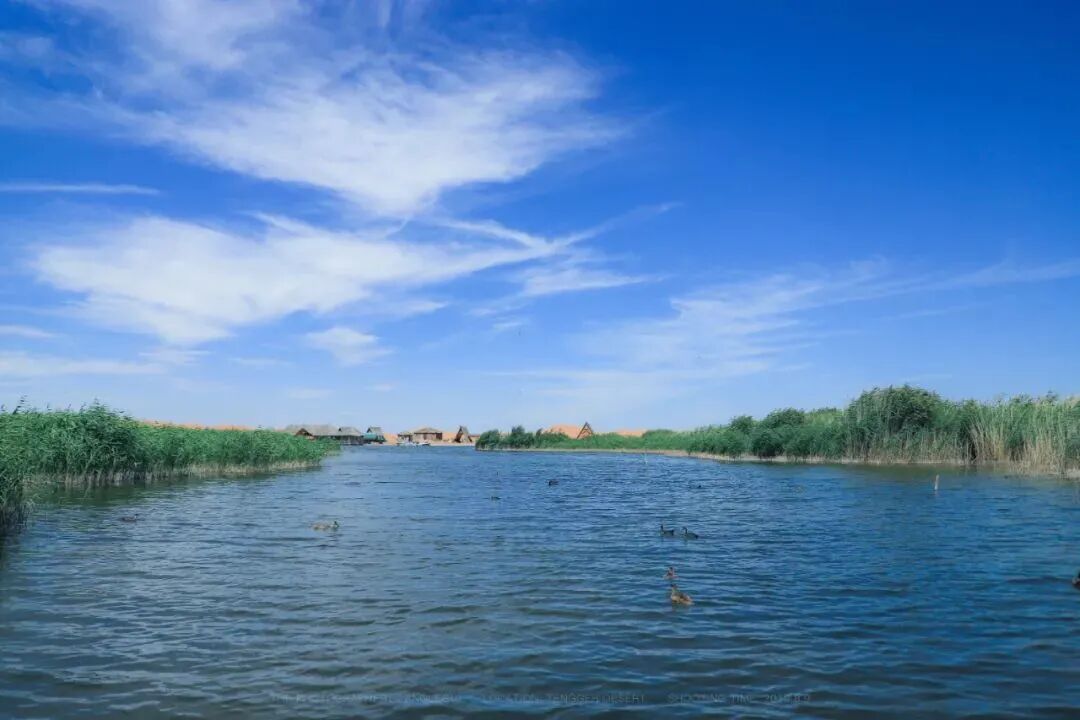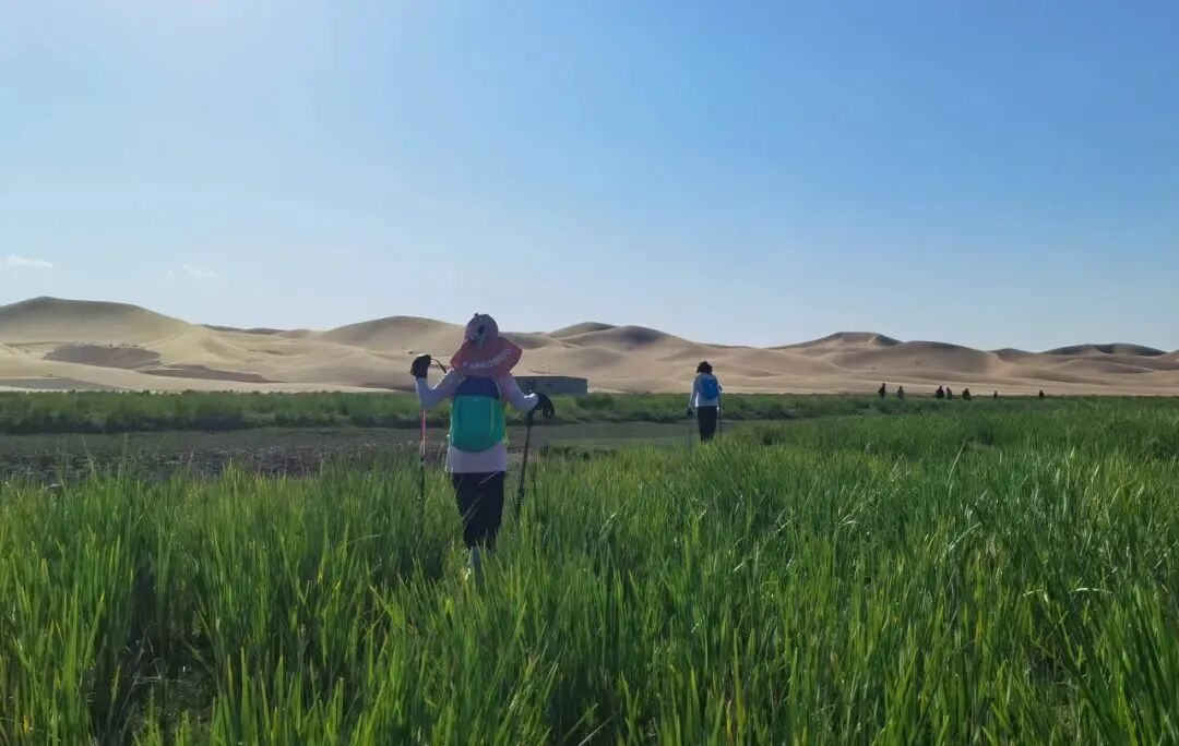 队伍穿越沙漠的最终点,就是月亮湖,水潭旁边芦苇密密,一直被被微风吹拂的摇摇晃晃。月亮湖是全球最具影响力的的沙漠深度体验地之一,湖的一边是沙漠,一边是绿洲;拥有一半咸水,一半淡水。