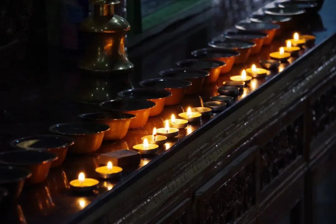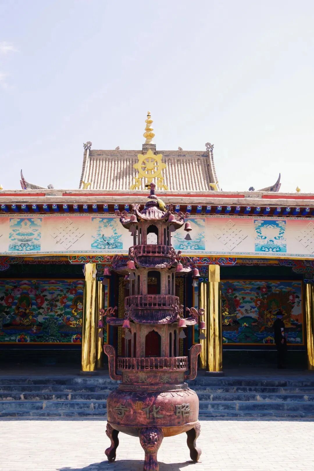 经过风车矩阵后来到昭化寺。这座原始的寺庙始建于 1734 年,已有300年历史,是当年六世达赖——仓央嘉措被流放时在内蒙古建立的第一座寺庙,他在此隐迹弘法,并度过余生,甚至圆寂后的法体在此存放了十年之久。寺庙至今保存完好,香火不断。