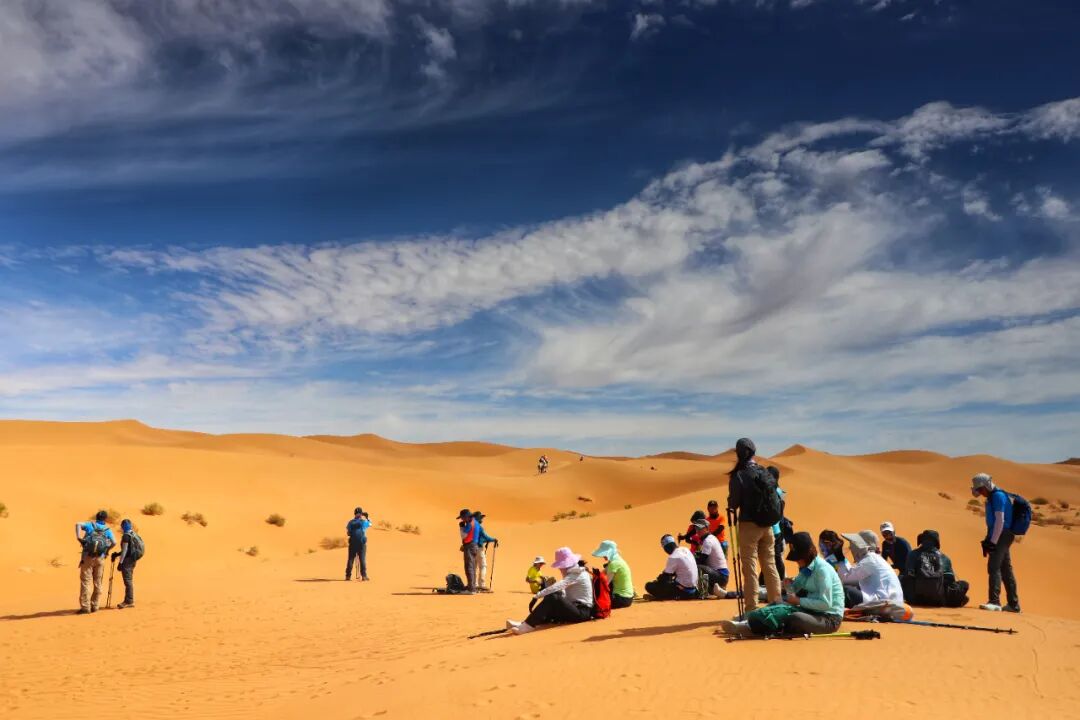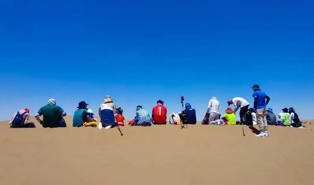 第四天的行程相对轻松,经过连日来的徒步大家已逐渐适应,领队将带领大家翻越 1391 米的敖包,它建在沙漠腹地的一座高沙山上,在特定时候会发出低沉的轰隆声,每年周边的蒙古人都会来此祈福祭奠。