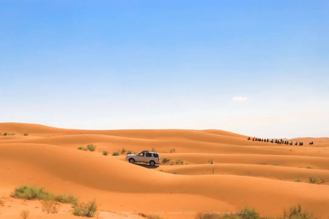 车队在清晨从银川出发,途径明长城、贺兰山,开始进入一望无际的戈壁地带。