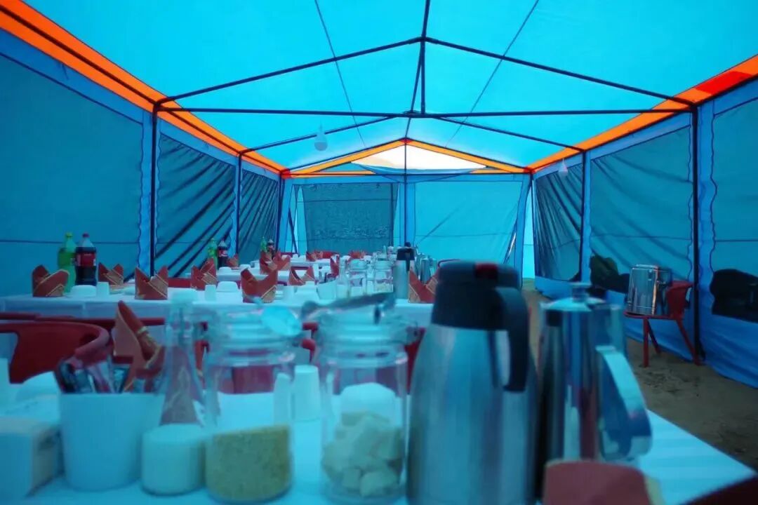 每天在到达营地前,工作人员都会搭建好大型宴会帐,摆好舒适的桌椅和一尘不染的餐桌,足够容纳几十人的团队同时在野外用餐,即使狂风暴雨也不怕,这是在沙漠腹地为您准备堪比星级酒店的服务。