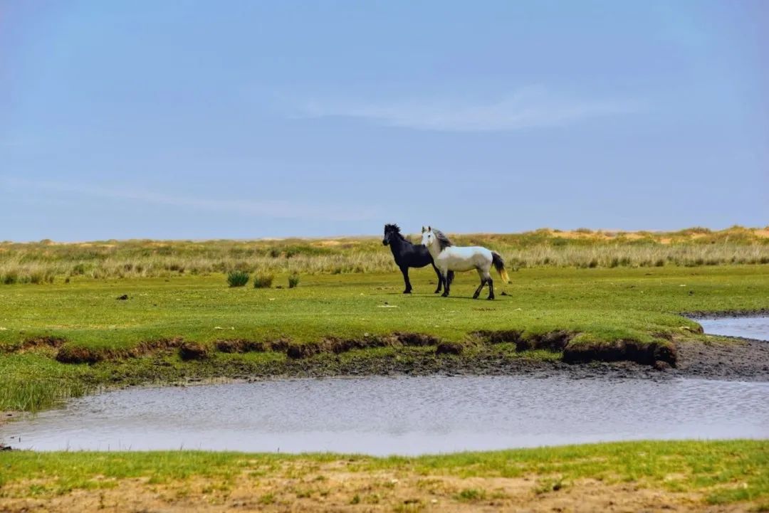 在这里,见不到人类对沙漠的刻板印象:黄沙漫天,也见不到大戈壁上寸草不生一派荒凉的样子,这里有绿草生长,绿洲散落在沙漠里,它们一坨坨、一块块地点缀、铺展在沙漠之中,远远望去,那星星点的草皮,更像是诺大沼泽中的漂浮的草墩,在日光下闪着粼粼的波光。