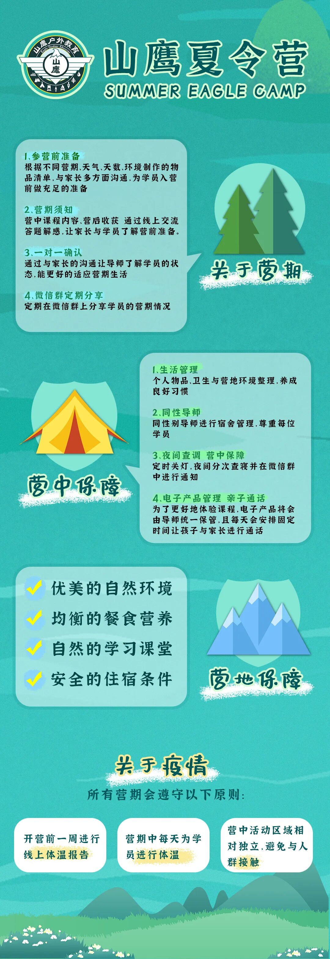 “山鹰户外教育”以多种形式的户外活动为载体,同时在结合国内现状的前提下,借鉴和吸收大量国外成熟经验。通过多年积累,“山鹰户外教育”已经拥有完整的进阶式课程体系,拥有了幼儿园(学龄前)、小学、初中、高中三个学龄段的校园课程,雏鹰课程和小鹰课程,高校课程,以及面向广大户外爱好者的山鹰户外爱好者课程。让每一阶段、每种需求的户外运动参与者都体验到专业、高效、安全的户外运动培训。
