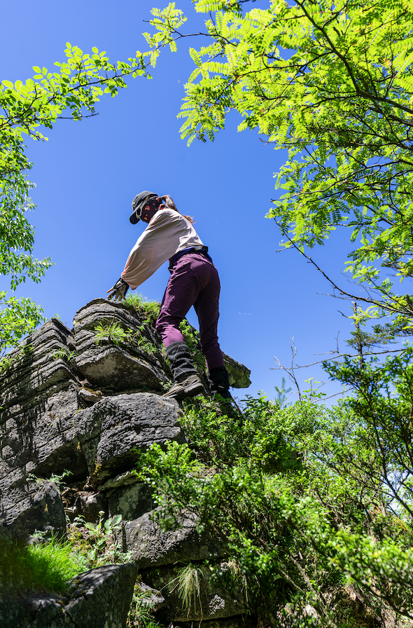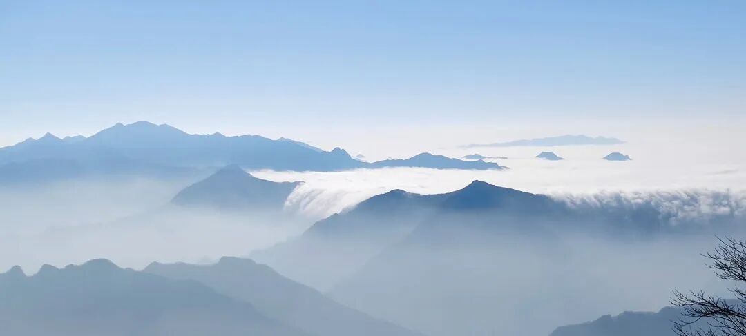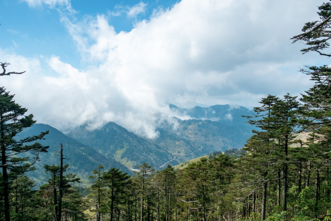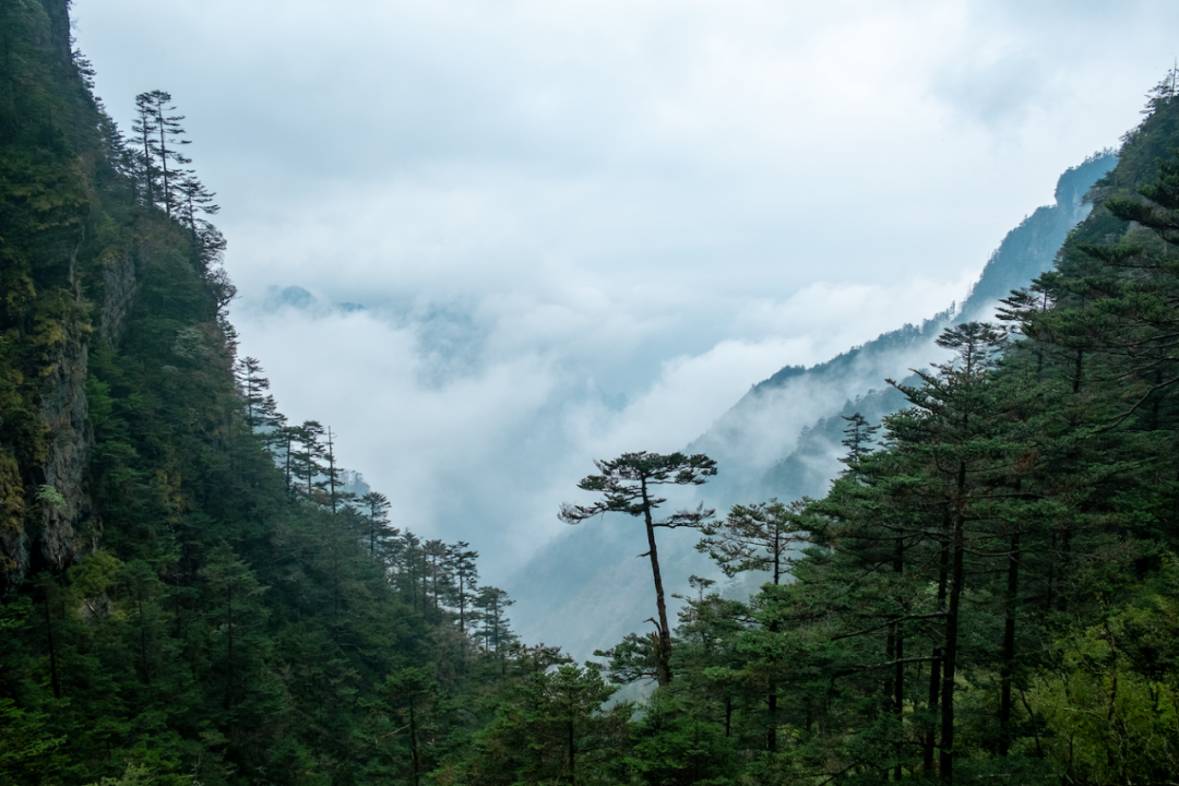 随着海拔上升,能见度逐渐提升,到达最后的山坡上,雾气从梦幻莫测的秘谷中升腾,站在神奇的高山之巅,视野开阔,对岸的峰峦横看成岭侧成峰,天地苍穹,尽收眼底。