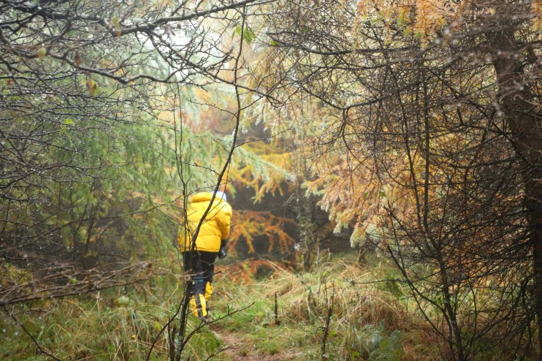 秋日薄暮,迷云压地,这密林一眼望去点点绿意配橙黄,层林尽染,满地落叶织红毯,萧瑟中竟透出一份浪漫。