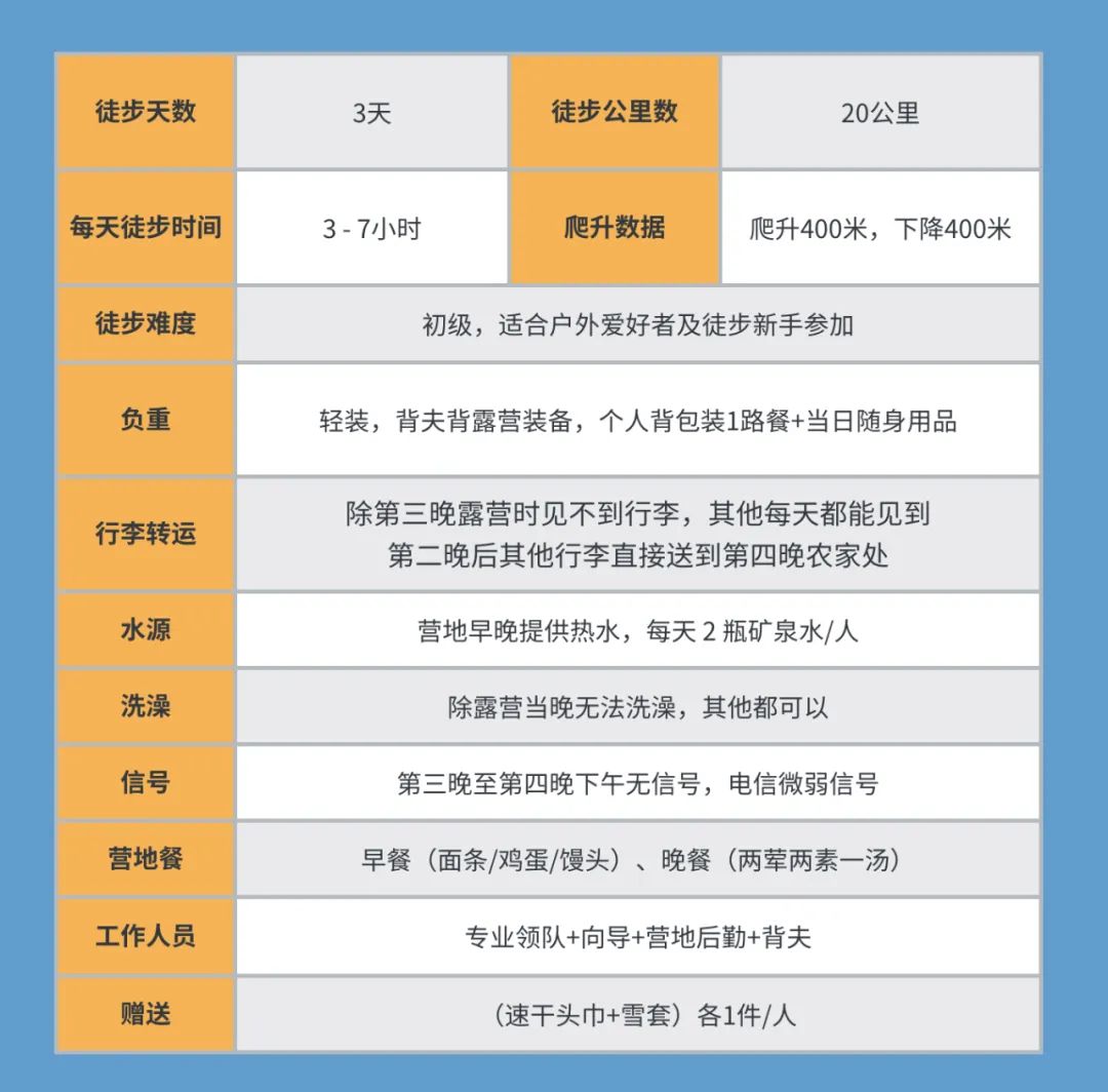 ▍箱包:建议20-30L左右专业户外背包,并配备防雨罩(如带行李箱,第二晚后会直接送到第四晚农家,第三晚露营时见不到行李箱);