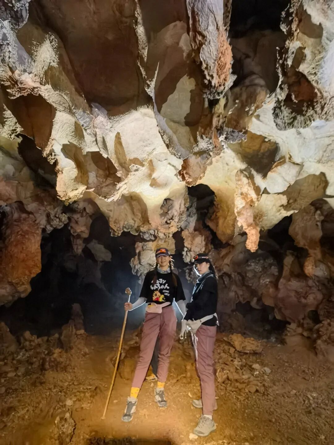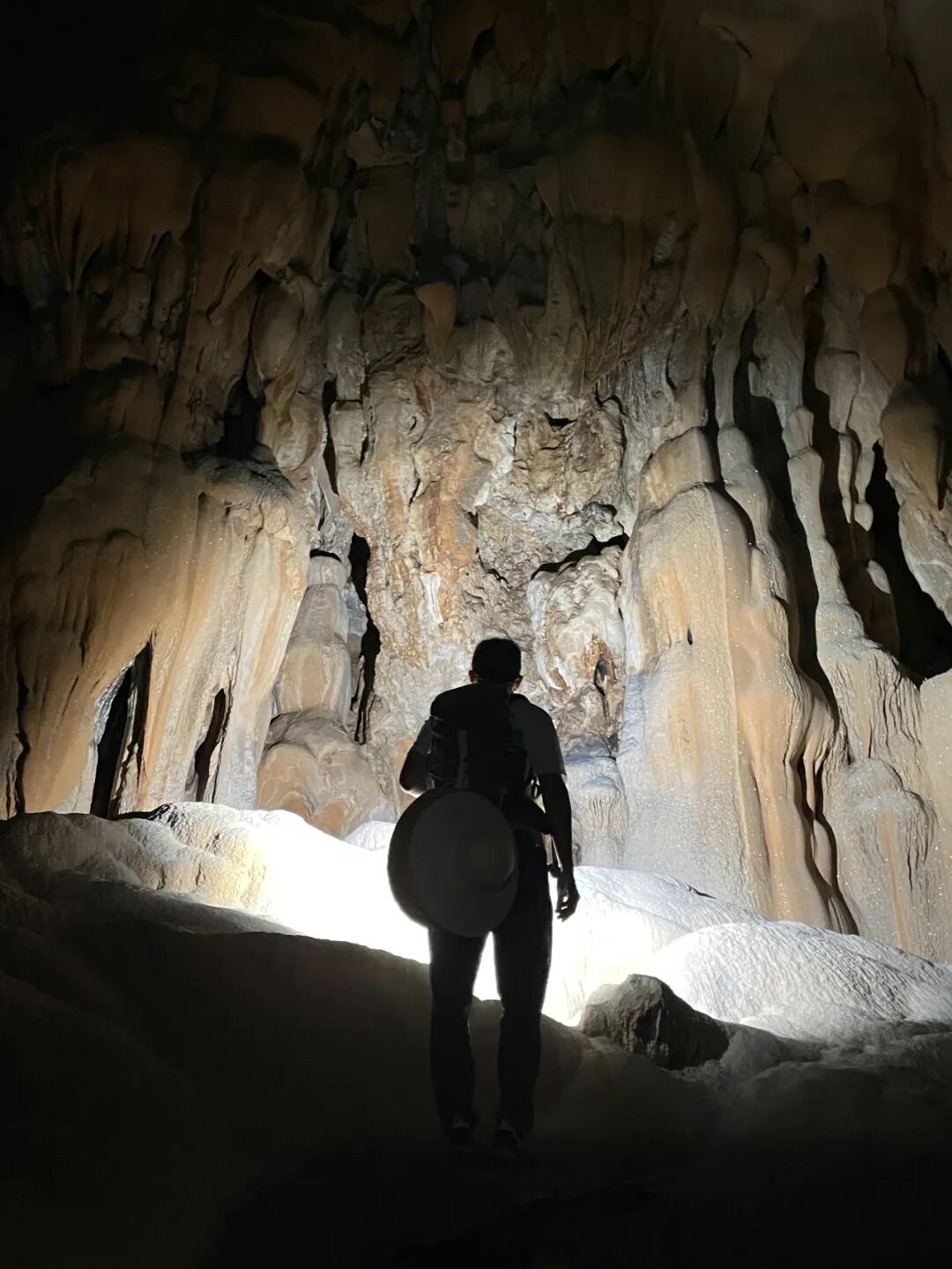 而更妙的是,大自然还慷慨地从坑底开了一个洞穴。让我们得以从底部的洞穴轻松穿入,而不用登顶从井口速降而下。洞穴进来后有一溶洞,穿洞而行,便是光怪陆离的奇幻地下世界,形态各异的钟乳石、石笋让人目不暇接。特别当光束打在上面时,整个晶体一闪一闪的,像夜晚群星璀璨,让人不觉连连惊呼,仿佛坠入银河星系的错觉。